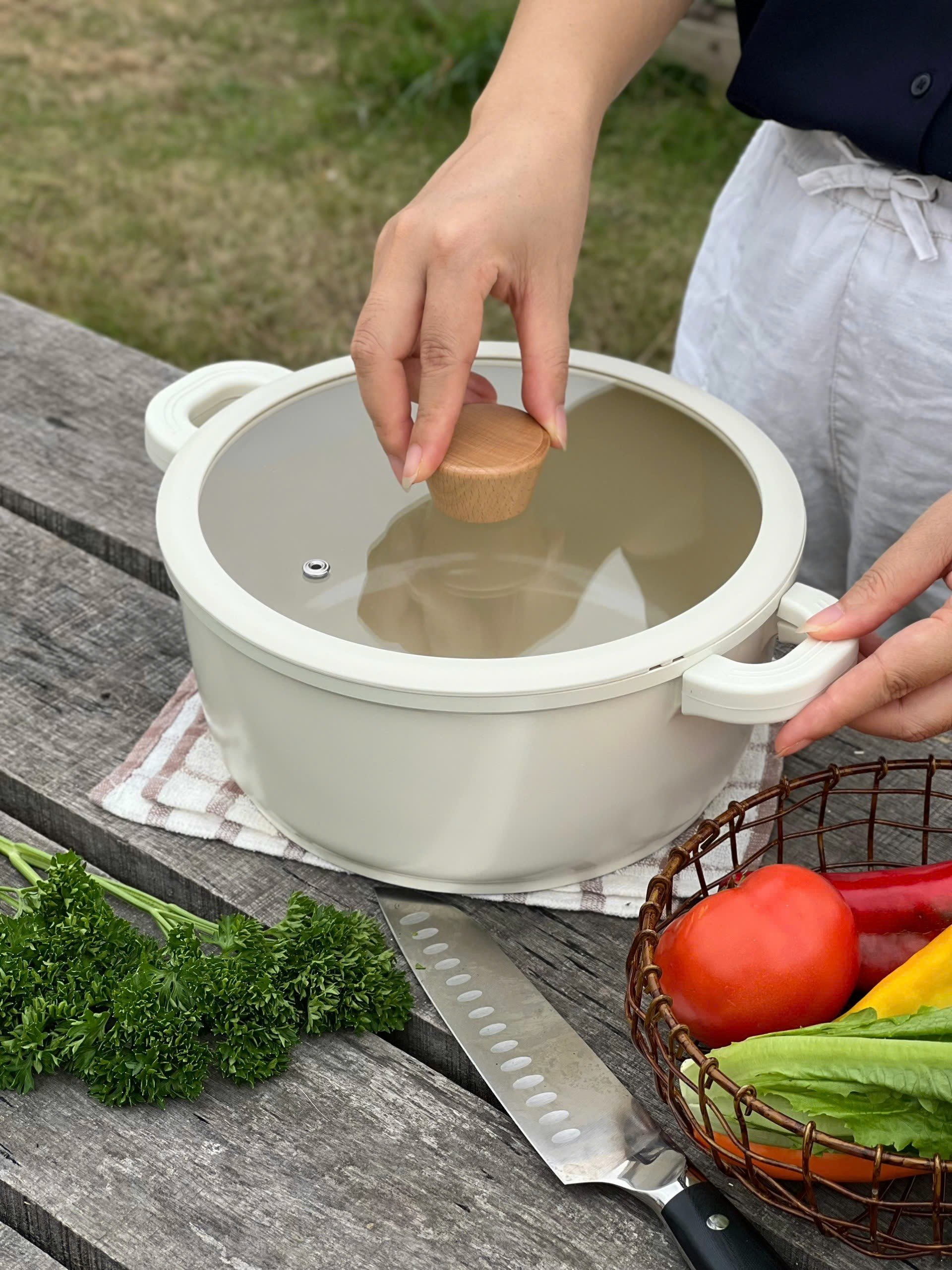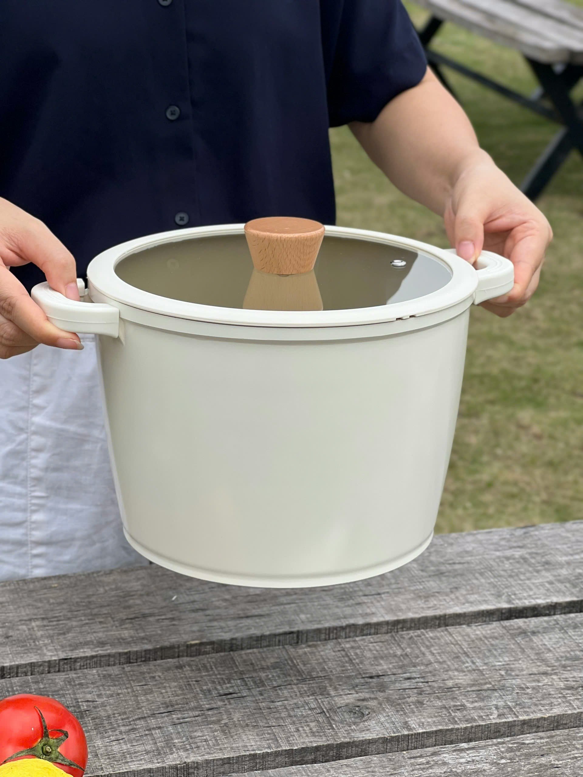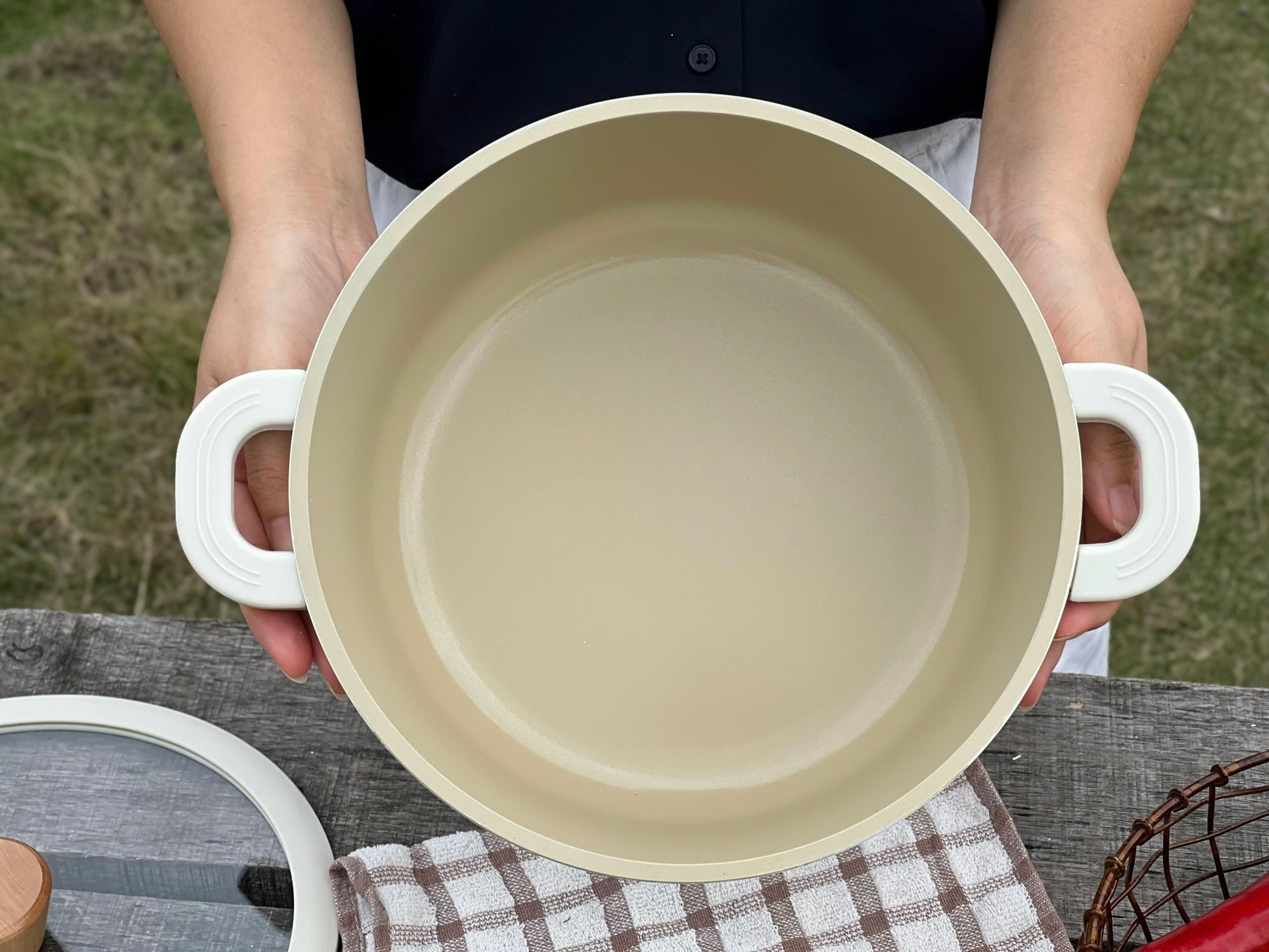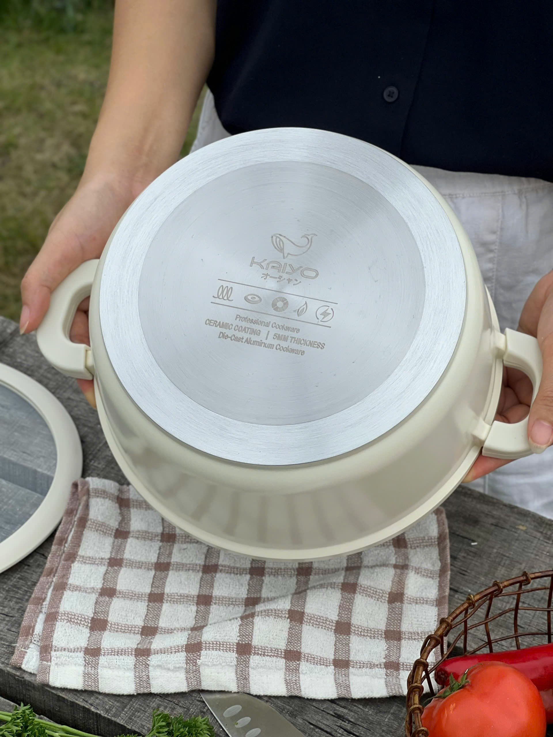 Toàn bộ nồi được phủ chống dính ceramic cả trong và ngoài. Nên các c yên tâm màu be vô cùng sang chảnh này ko hề bám bẩn đâu ạ 👍👍