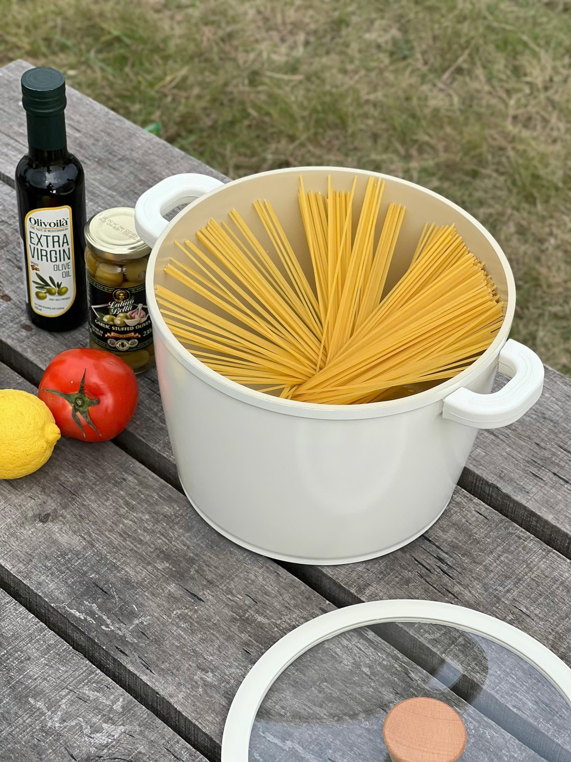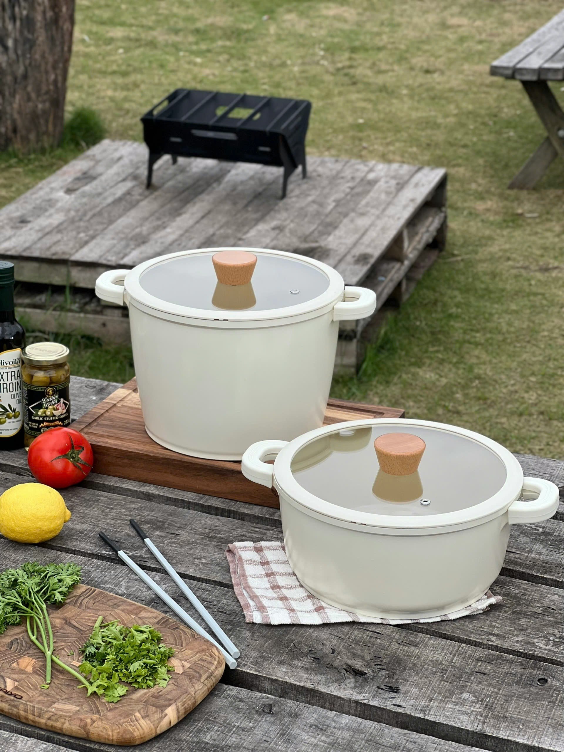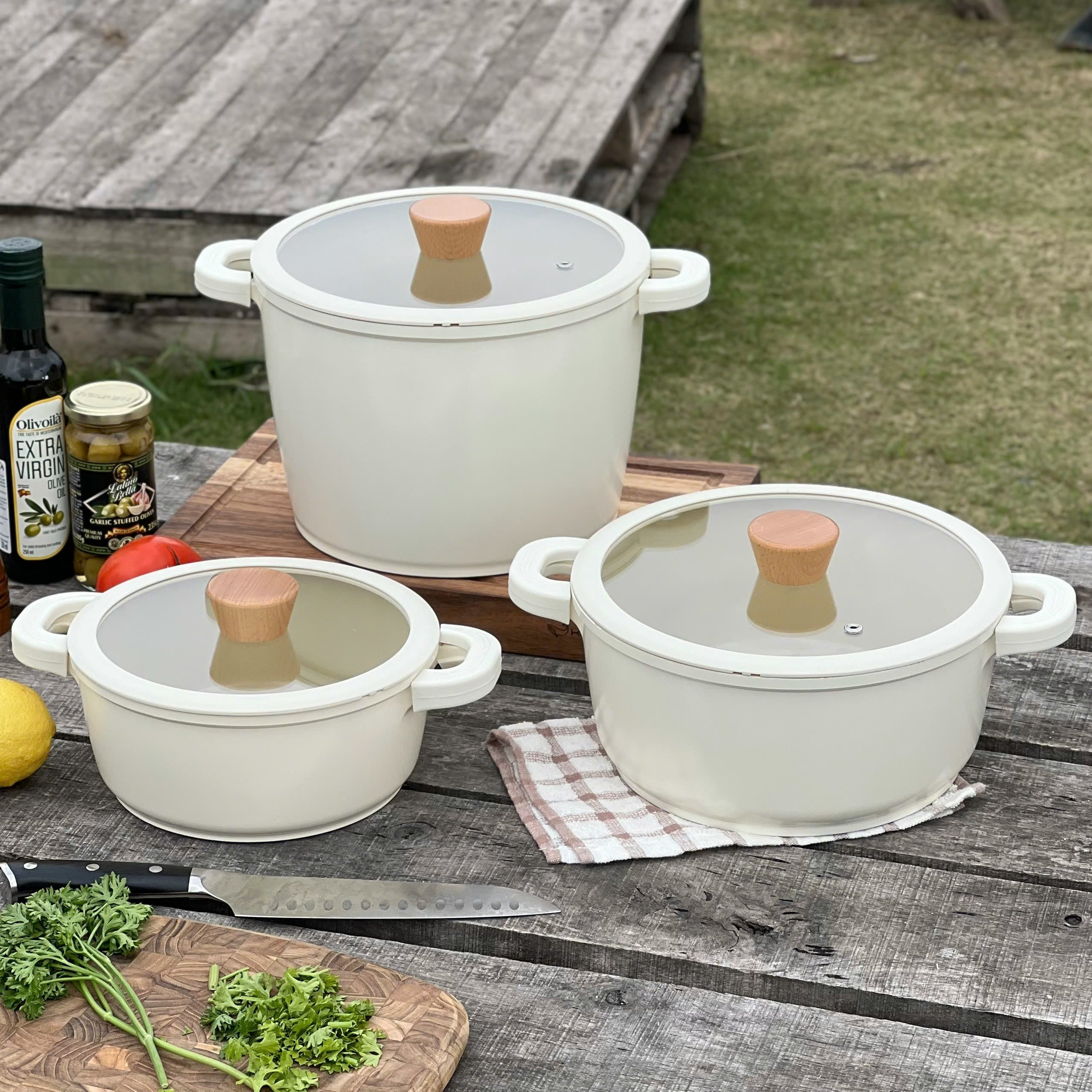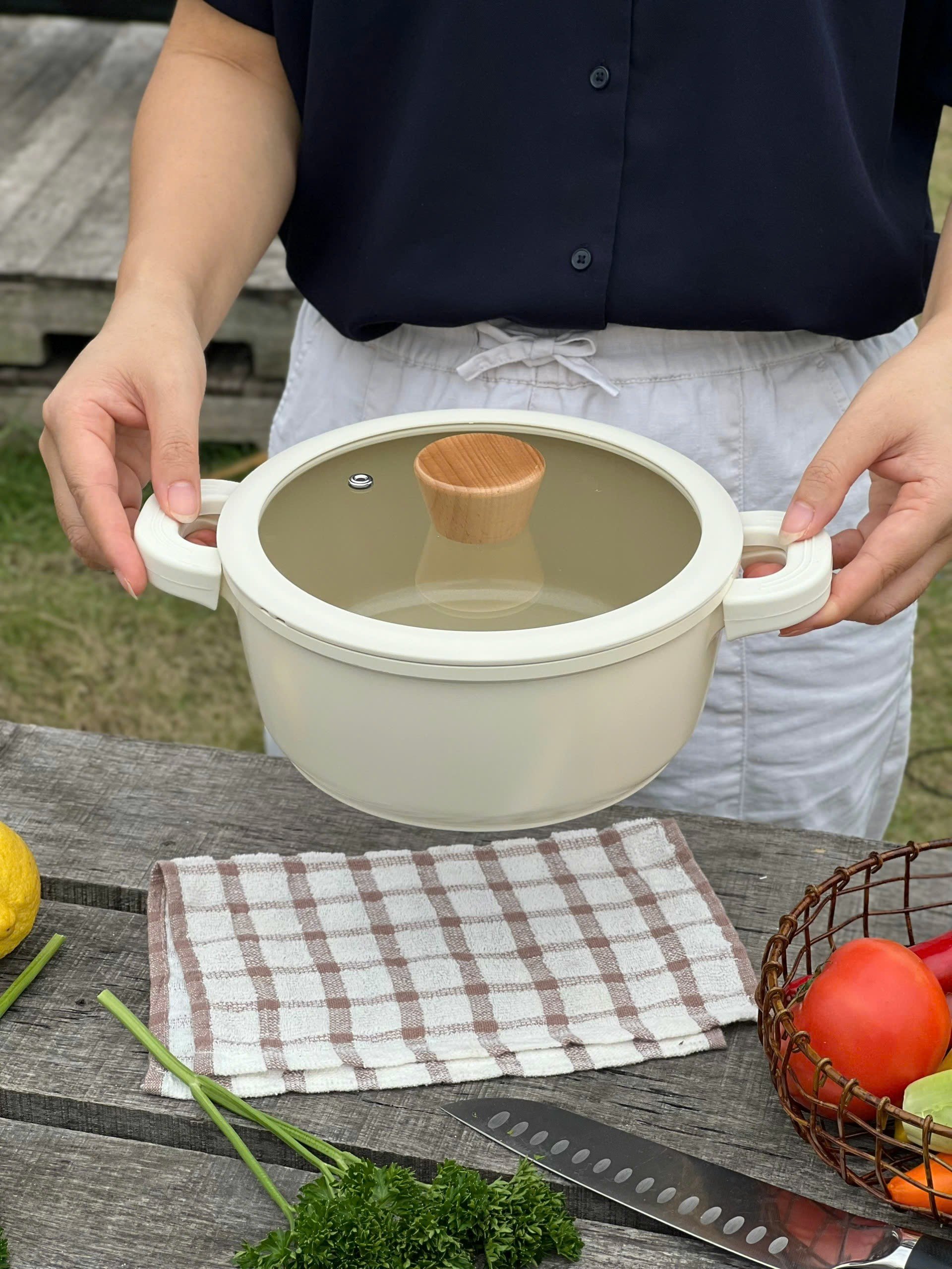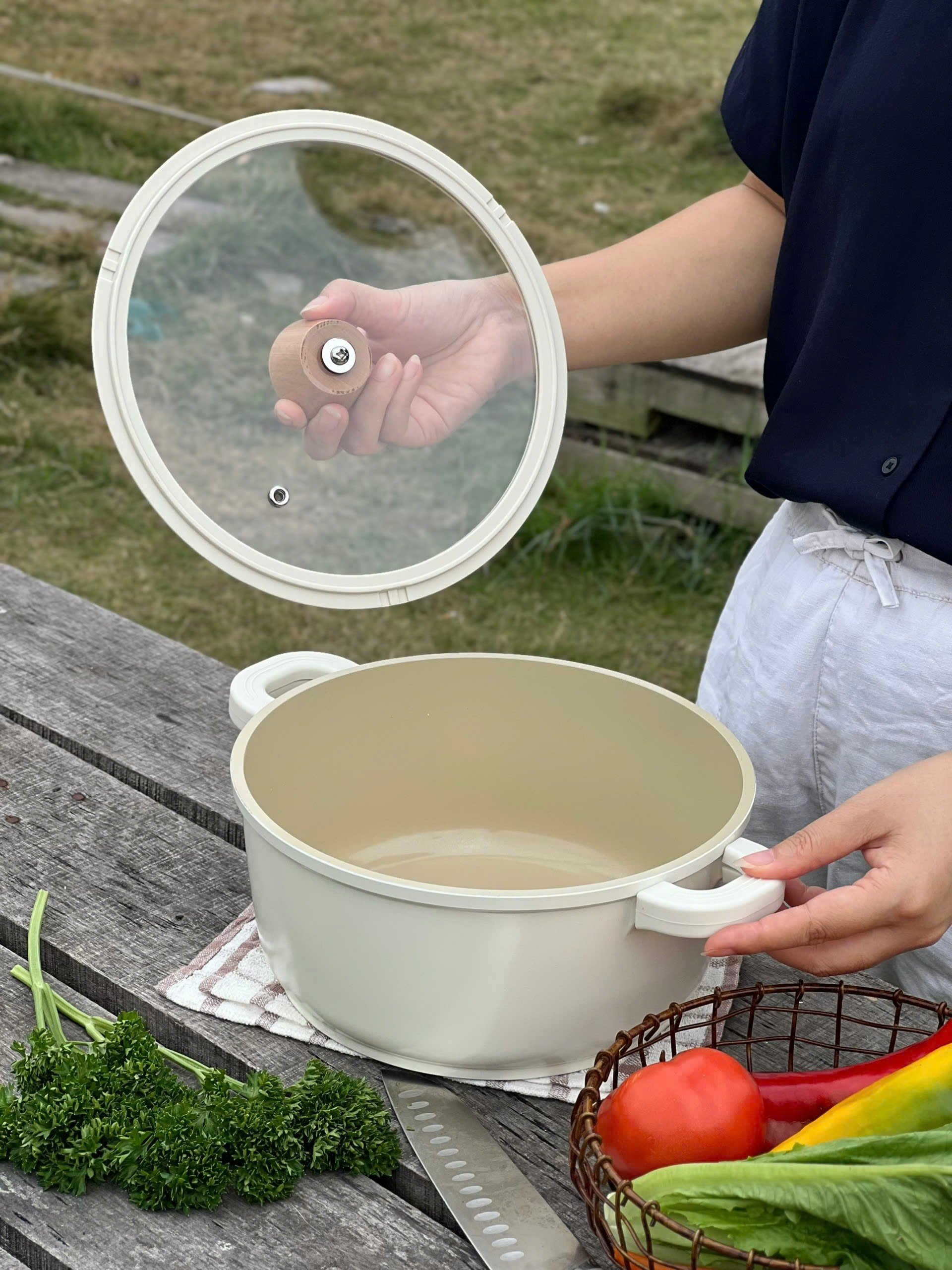 Toàn bộ nồi được phủ chống dính ceramic cả trong và ngoài. Nên các c yên tâm màu be vô cùng sang chảnh này ko hề bám bẩn đâu ạ 👍👍