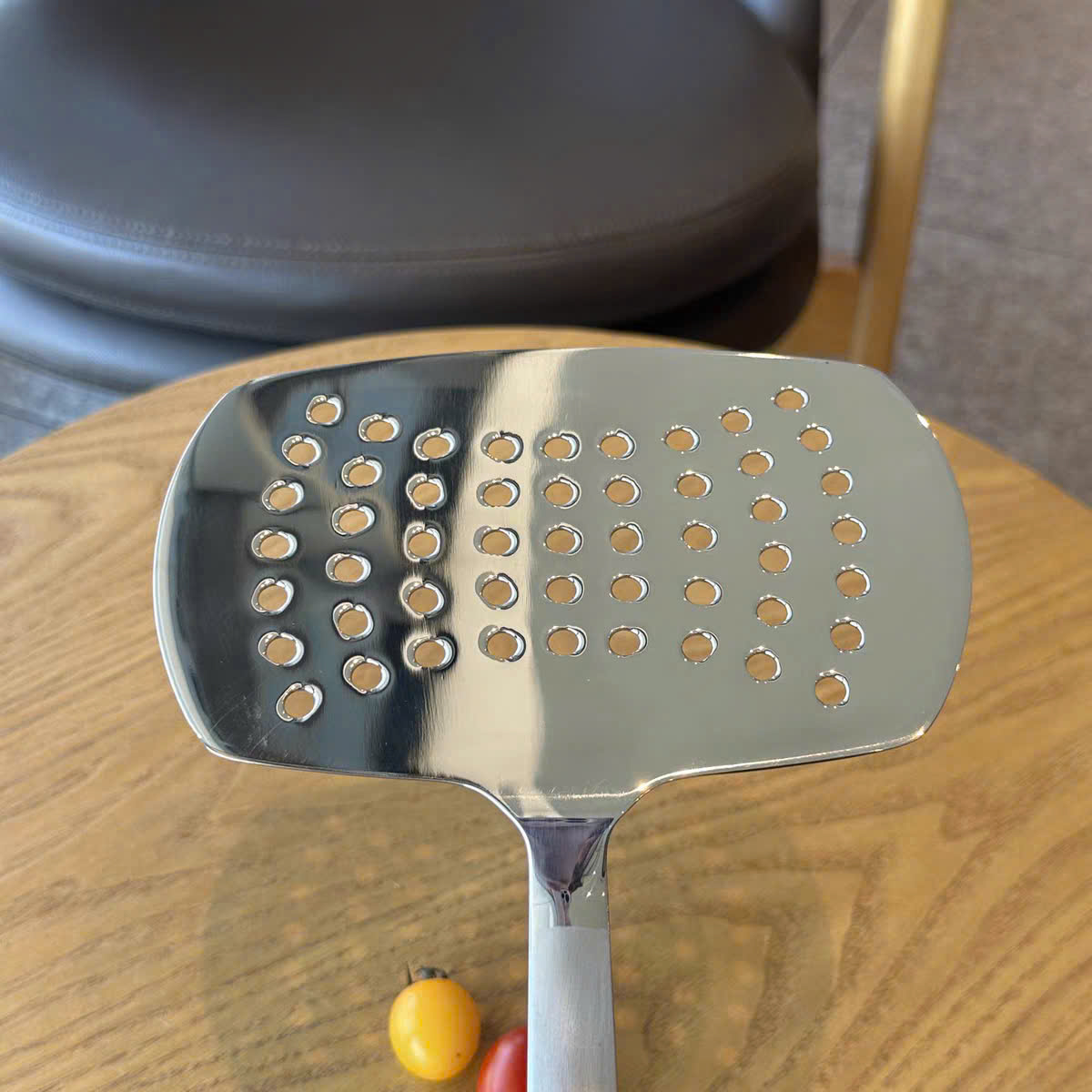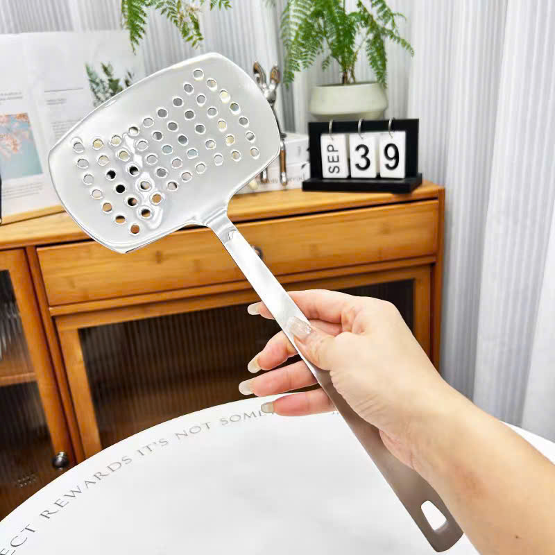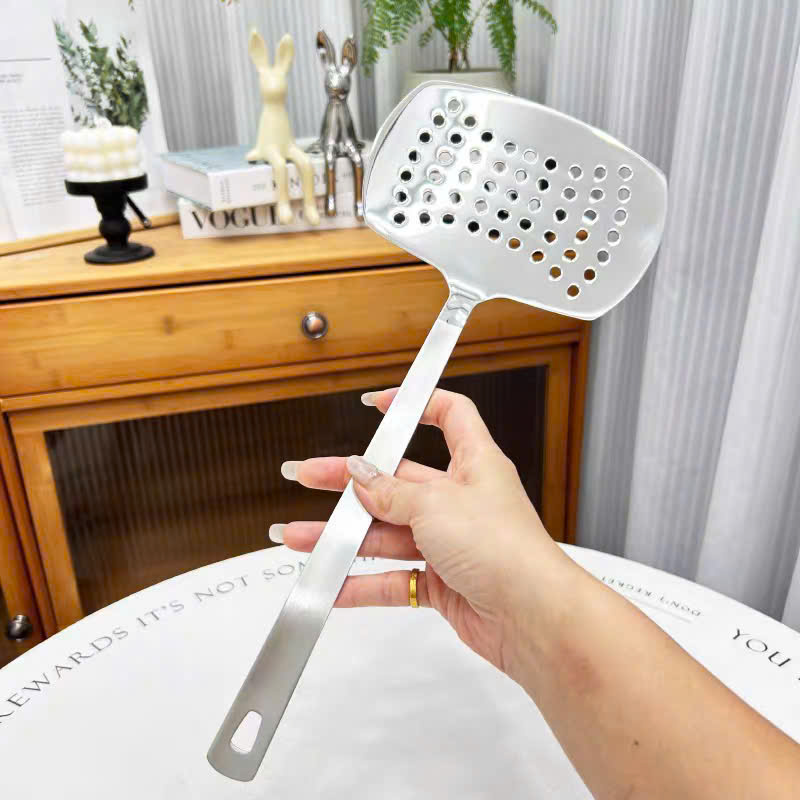 – Đầu xẻng đánh bóng sáng gương, lướt nhẹ dưới món ăn mà không làm trầy chảo, lại có lỗ thoát dầu giúp món ăn ráo và giữ được vị ngon tự nhiên.